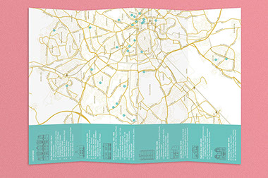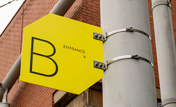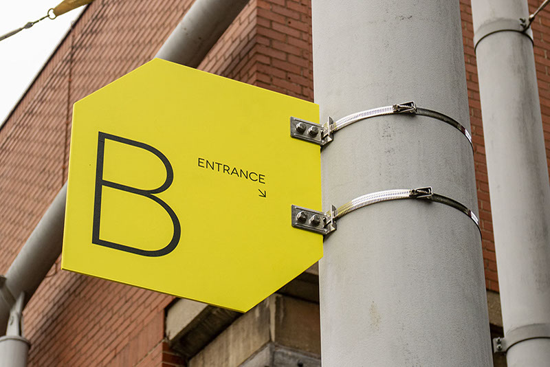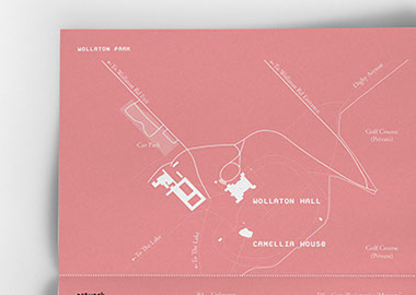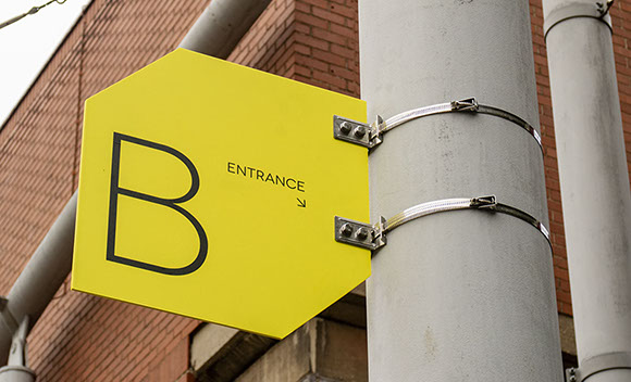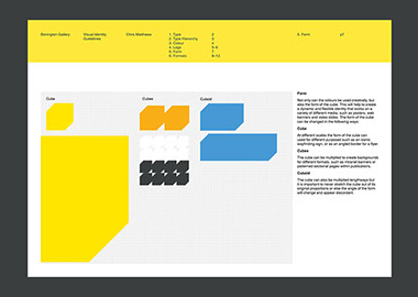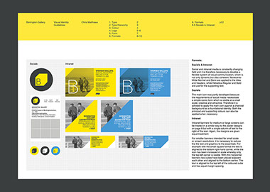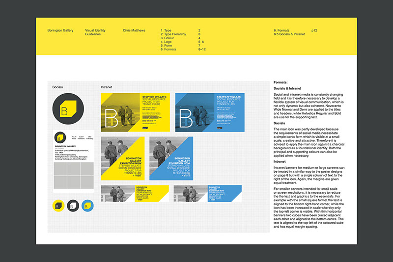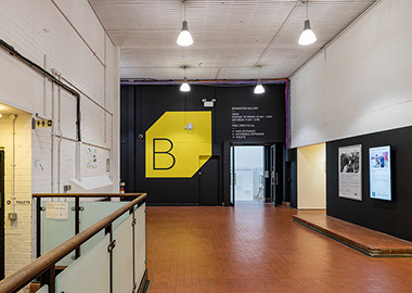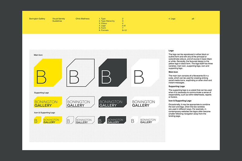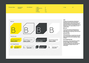This gallery is a contemporary arts venue positioned within a complex university building. This makes it hard to identify and locate, despite its significant history. The existing visual identity was appropriate but required modification to make the gallery more noticeable and appealing. As such the typeface and logo were retained but the faint grey colours and outlines were re-prioritised in favour of strong block colours and a refined box icon. A near luminous yellow was favoured as the primary hue within the new colour system because this contrasted with the university's bright pink visuals and the strong red brick of the Bonington building.